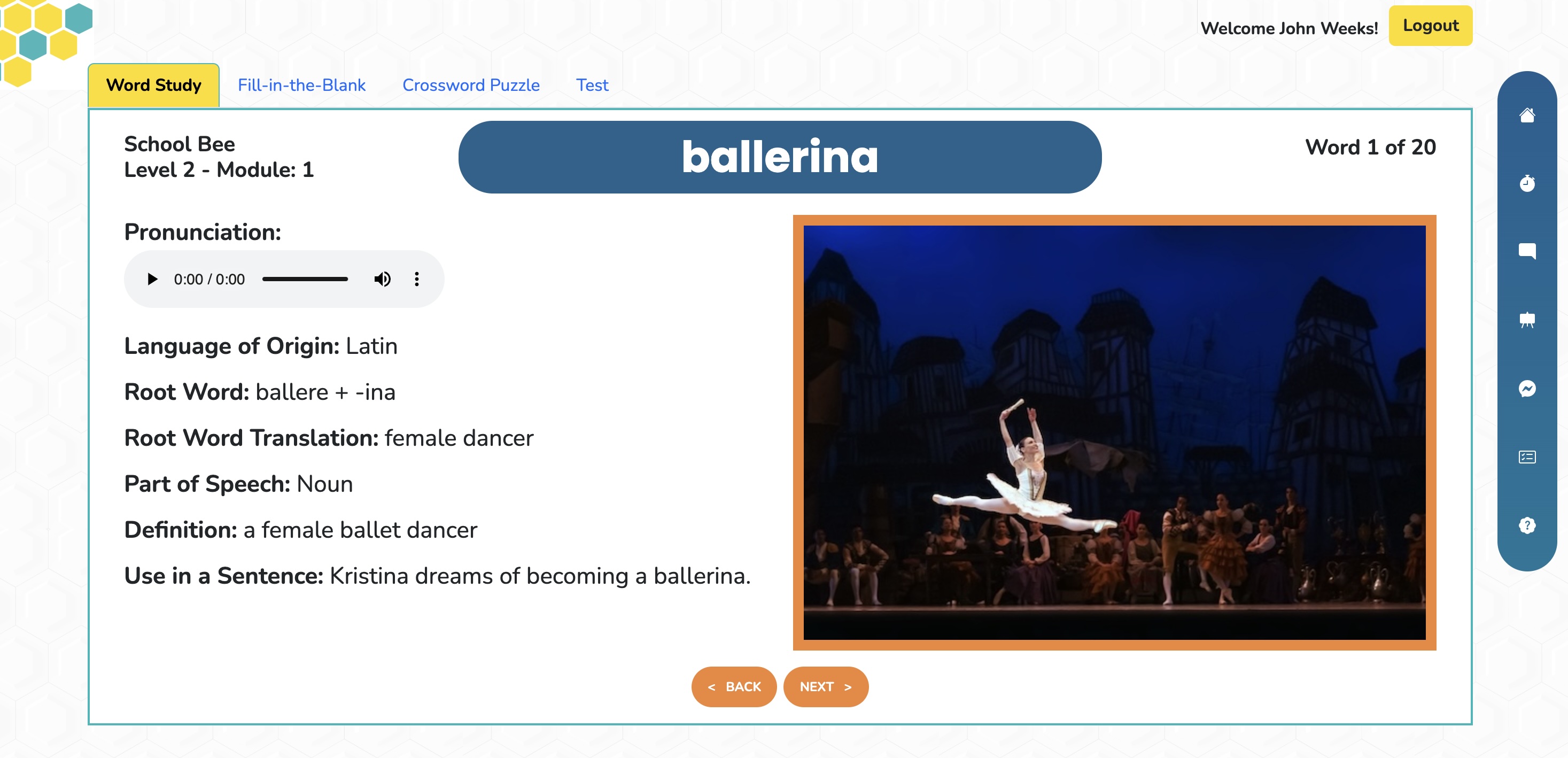 After reviewing this screen, you can advance to the next word in the module by clicking Next or pressing Return on your keyboard.